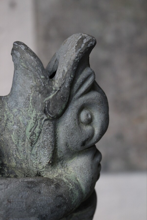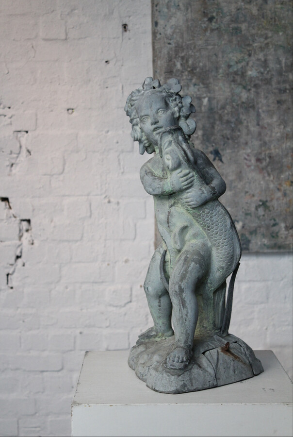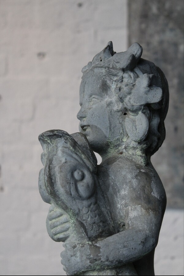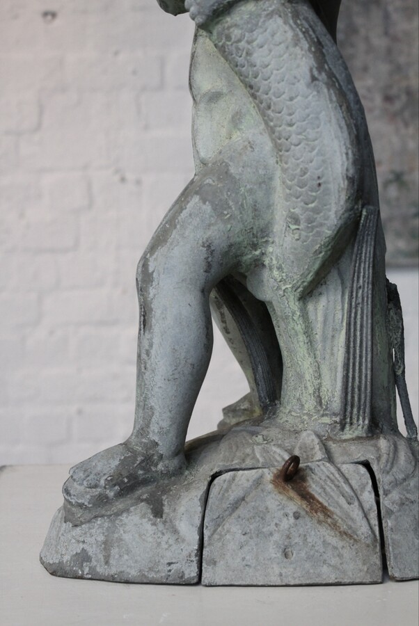 Lead fountain. France. End of 19th century. Height 58cm. Representing a putti holding a fish. Beautiful patina.