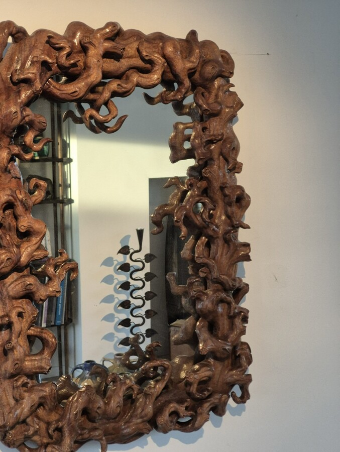 Mirror (size 50x70cm) surrounded by a frame in mangrove root. Around 1970.
