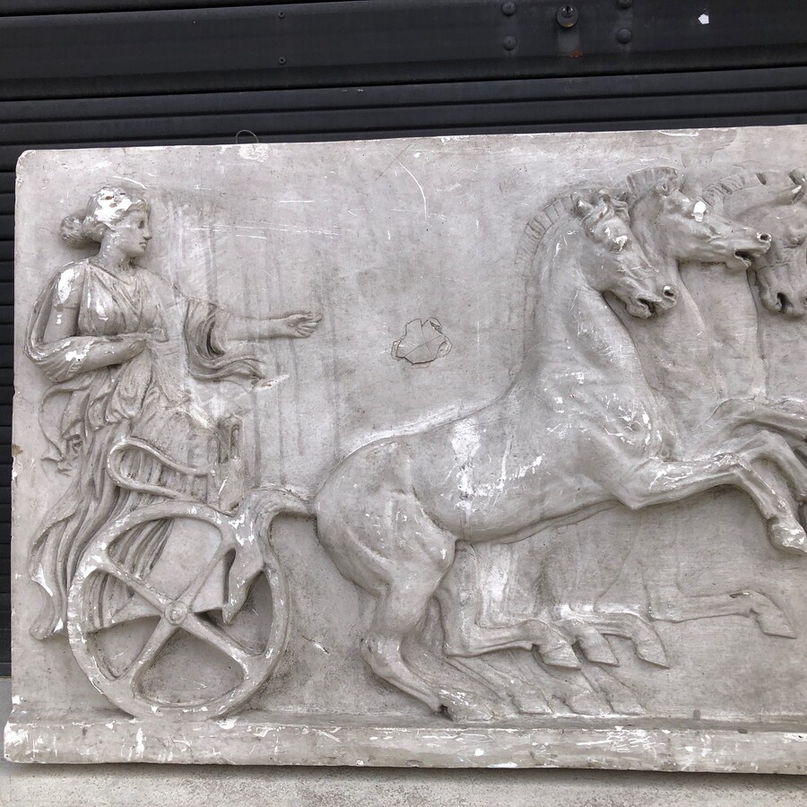 Academic plaster bas-reliëf representing «Eos driving his chariot». Of Hellenistic style, dating from the 1st Century BC, the original marble can be seen at the Museum of Lisbonne. This bas-relief shows Eos driving his chariot with his lover Tithon or Cephalos at the head of the horses.