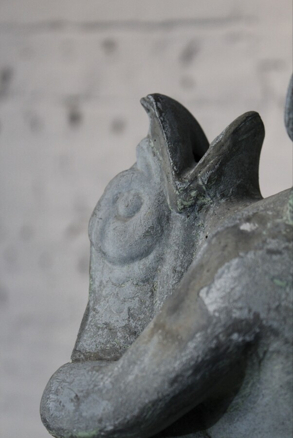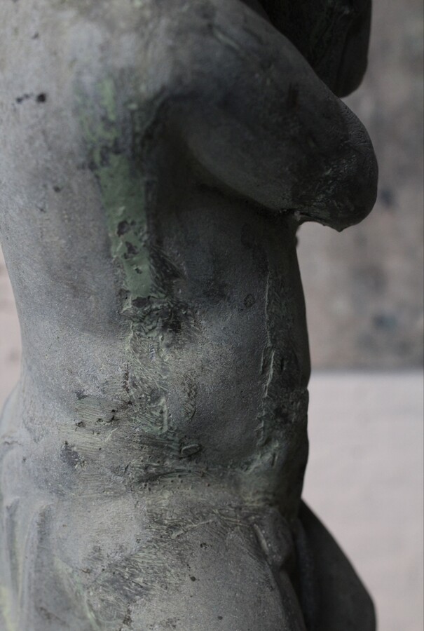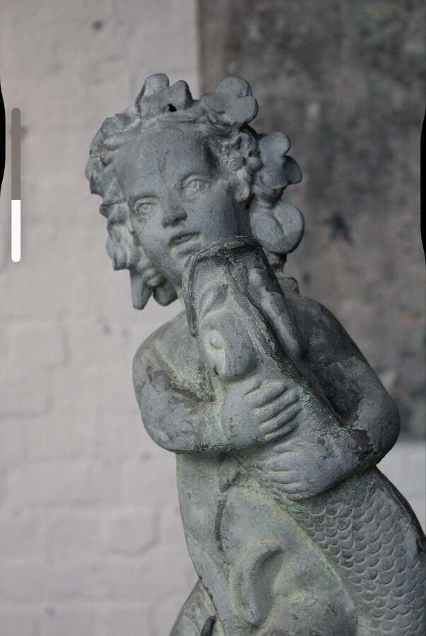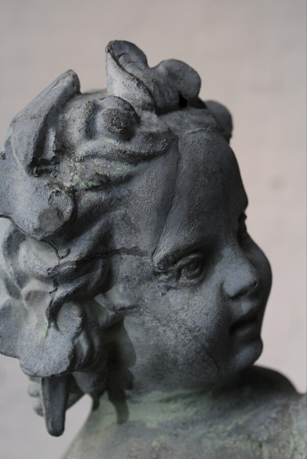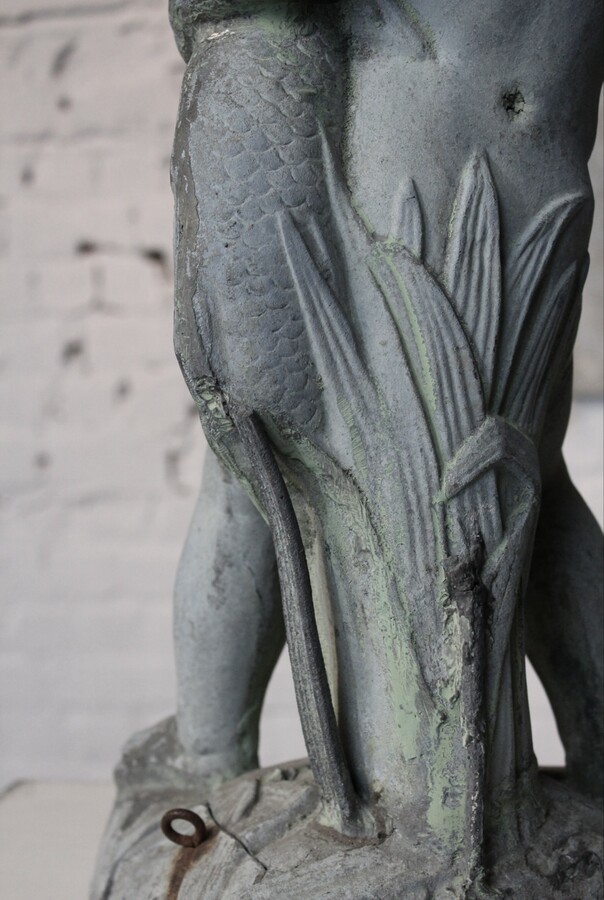 Lead fountain. France. End of 19th century. Height 58cm. Representing a putti holding a fish. Beautiful patina.