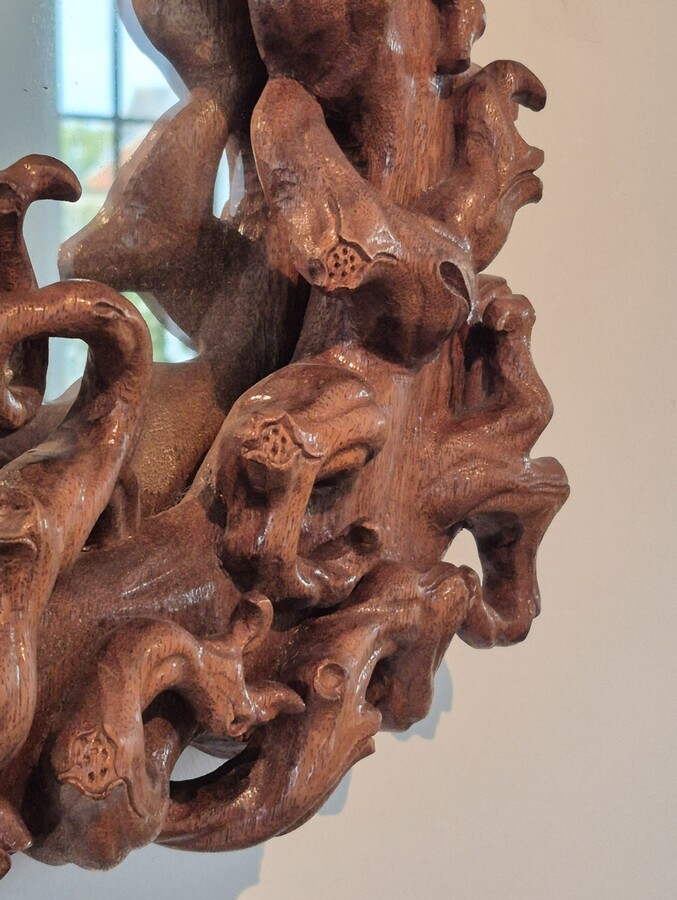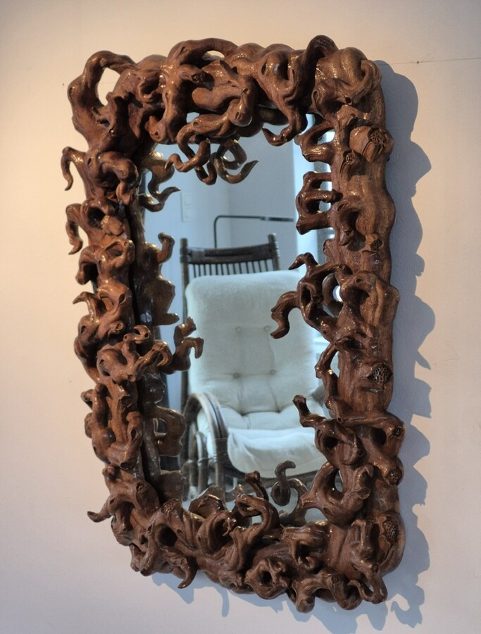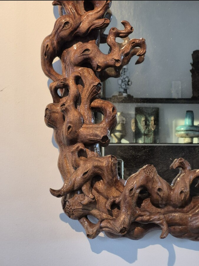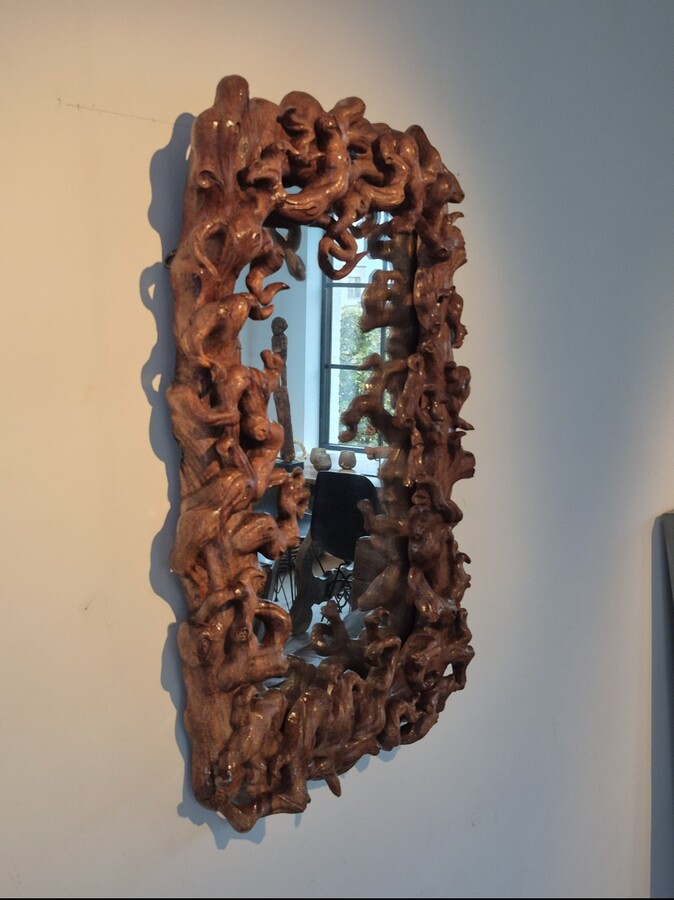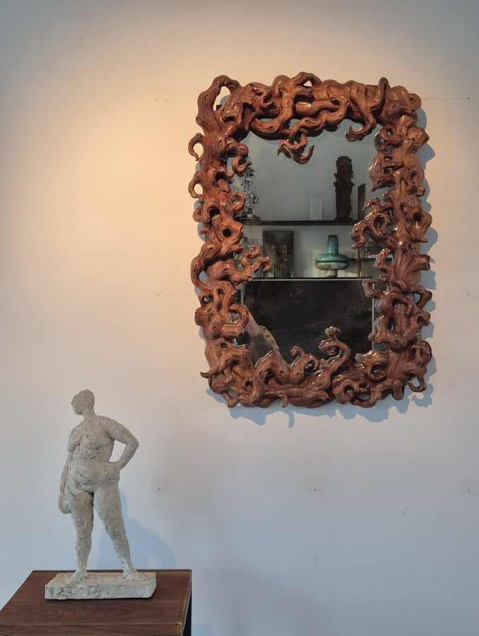 Mirror (size 50x70cm) surrounded by a frame in mangrove root. Around 1970.