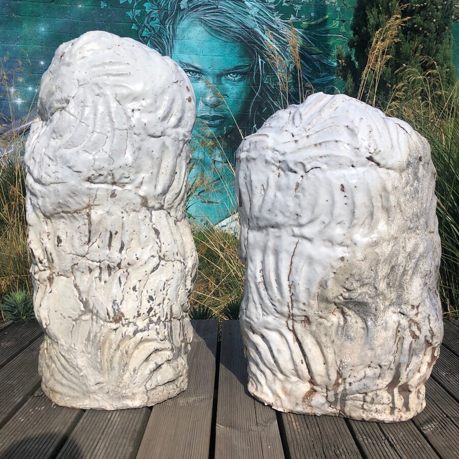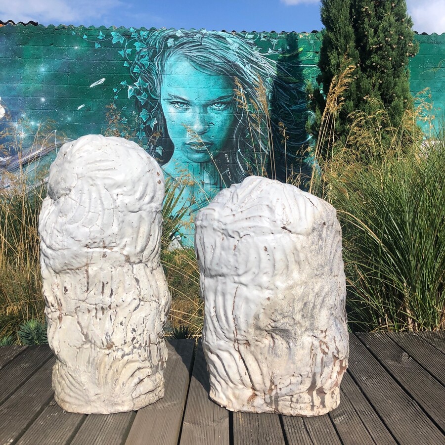 (La trace du vent) from 2015 , in glazed stoneware with thick milky white enamel and ash texture from the flames. These works were exhibited at the Museum La Piscine at Roubaix (North of France) during March and April 2015. Hervé Rousseau works and lives at La Borne. Unique pieces. Respective heights 95 cm (38 inches) and 85cm (34 inches) Sold as a pair. Fired with full flame in a Naborigama wood oven for over six days. These pieces are marked by the artist’s gestural imprint. Rough-bodied blocks, landscapes and torsos, marked with thumb, palm and foot imprints. His sculptures are looking like magma, mineral, eroded, archaic, brutalist, exploded, cracked, alive, mysterious. He traveled in Africa (Togo and Mali) in the 1980 and 2000. These trips are «initiatory» trips where African potters become major players in his sources of inspiration. This série especially found his inspiration during his visit of the Musée Fenaille at Rodez, where a number of “statue-menhirs“ sculptures can be seen. These sculptures were find in the wild around Rouergue (South of France) and are dated from the period between 3,300 and 2,200 B.C. Of great rudeness, his work show the interaction of his body and his hands with the organic matter. Highly appreciated and respected on the French scene since the 1980s thanks to galleries faithful to his career including that of Hélène Aziza in Paris. He exhibited in 2017 in collaboration with Johan Creten and Lucien Petit at the Centre céramique contemporaine de La Borne. Hervé Rousseau has seen a growing international consideration with exhibitions in particular in Great Britain , Belgium , Germany , Japan , and China.